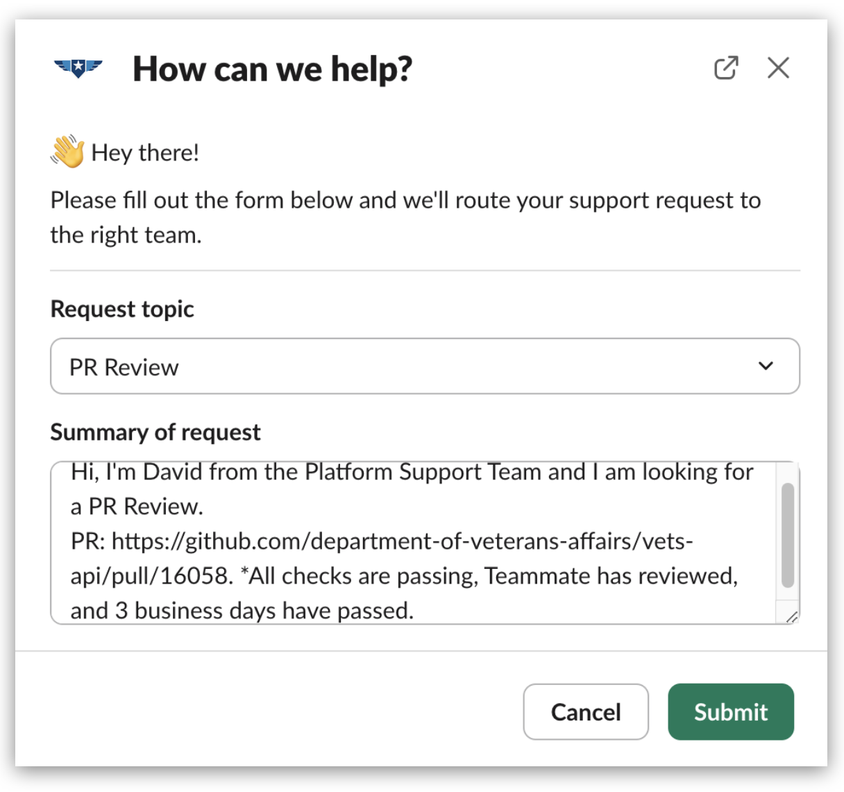 This page lays out how to get help from someone on the Platform using the Slack workflow in the #vfs-platform-support channel. This allows us to automate support request tracking so we can improve Platform Support over time.